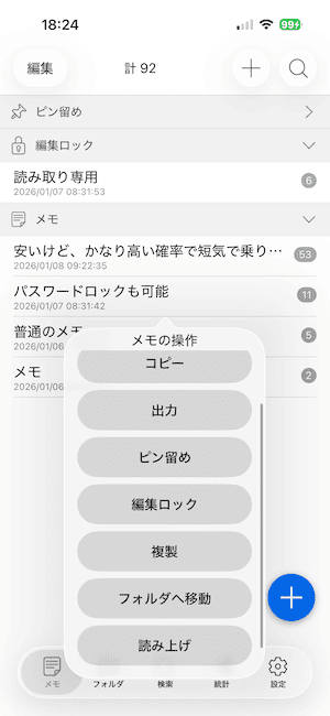 メモの一覧画面 では、セルを 長押し することで、コピー・複製・出力・読み上げ・ピン留め・ロック など、さまざまな操作を行うことができます。