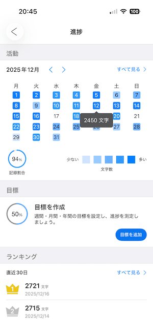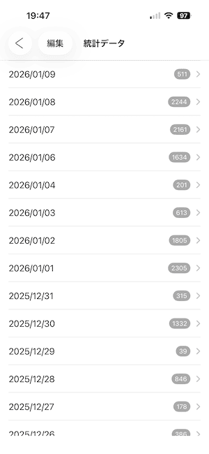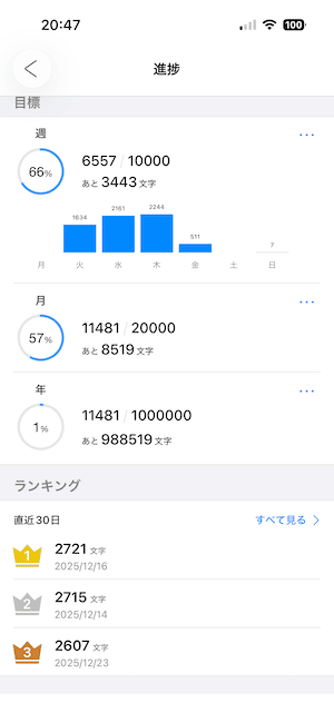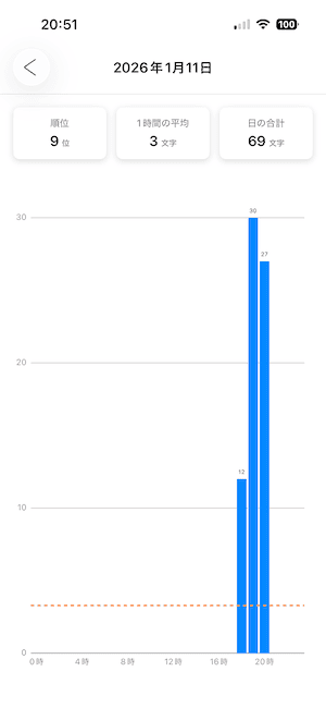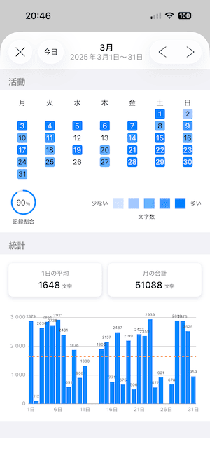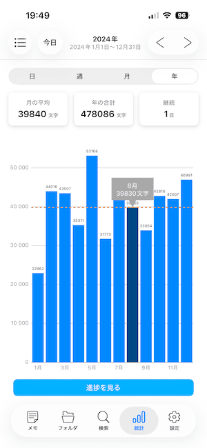 メモ・フォルダで作成したメモの文字数は、統計タブ にグラフとして表示されます。