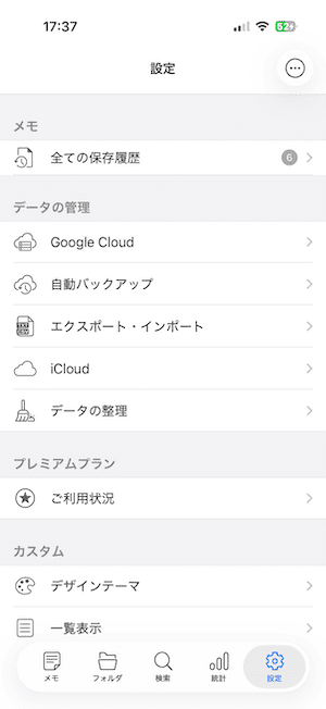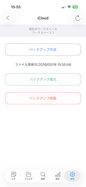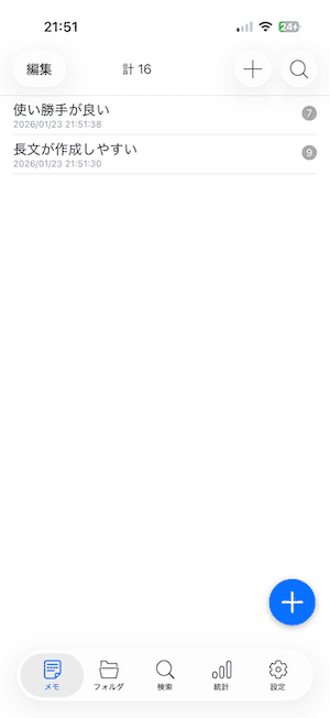 「メモ・フォルダ・検索・統計・設定」 の5つのタブで構成されたメモアプリです。