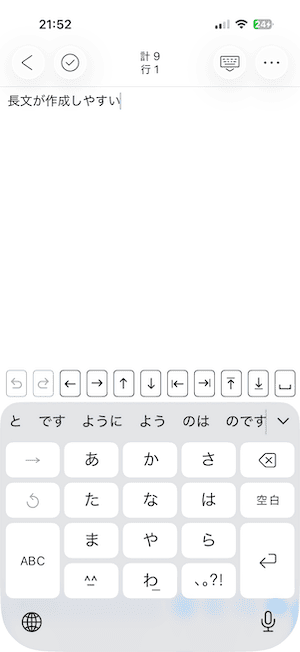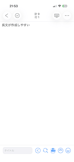 「キーボードを下げるボタン」をタップすると、テキスト表示エリアが広がり、タイトル入力や入力補助機能も表示されます。
