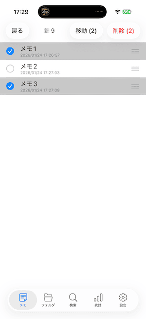 メモやフォルダの一覧画面では、並び順の変更や複数選択による削除など、さまざまな操作を行うことができます。