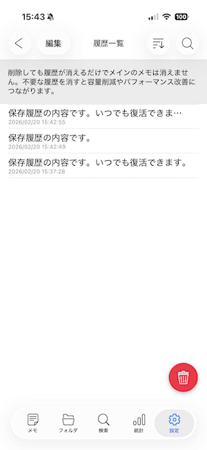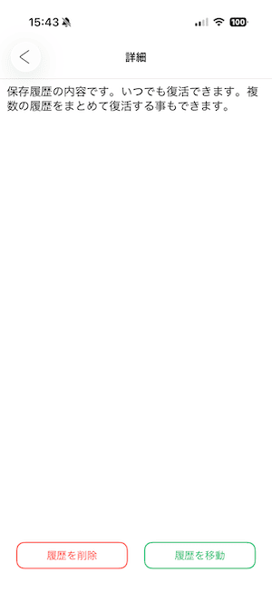 履歴からメモを復活させることができます。履歴を削除しても、元のメインメモは削除されません。