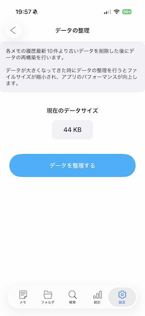 データを整理する を実行すると、すべてのメモの保存履歴が最新10件のみ残るよう整理され、古い履歴データが削除されます。